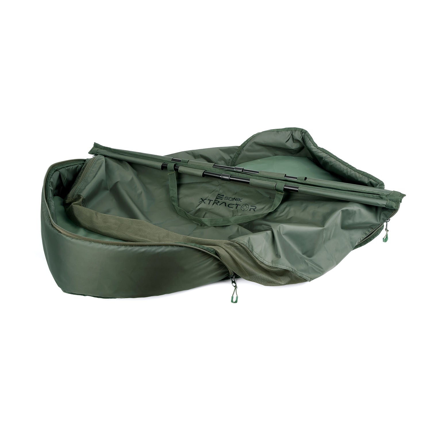 Składane łóżeczko marki Sonik model Xtractor przy Kolor zielony, szczególnie do łowienia karpi.
