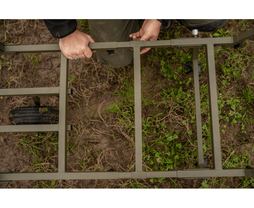 - Wyposażony w wytrzymałe opony i duże stopki typu błotnego Korum zapewniające stabilność na nierównym terenie