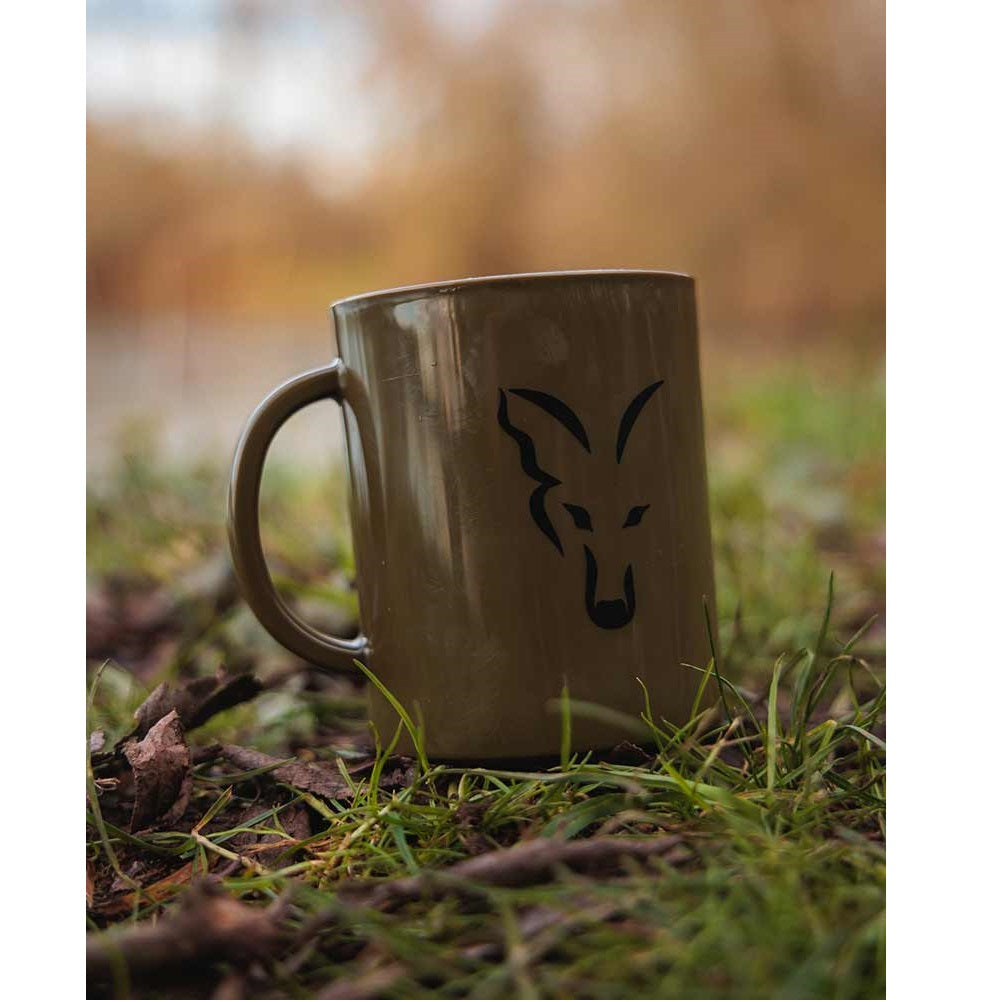 Markowy kubek Fox z kolorowym wzorem zielony i logo w kolorze czarny, specjalne do połowu karpi.
