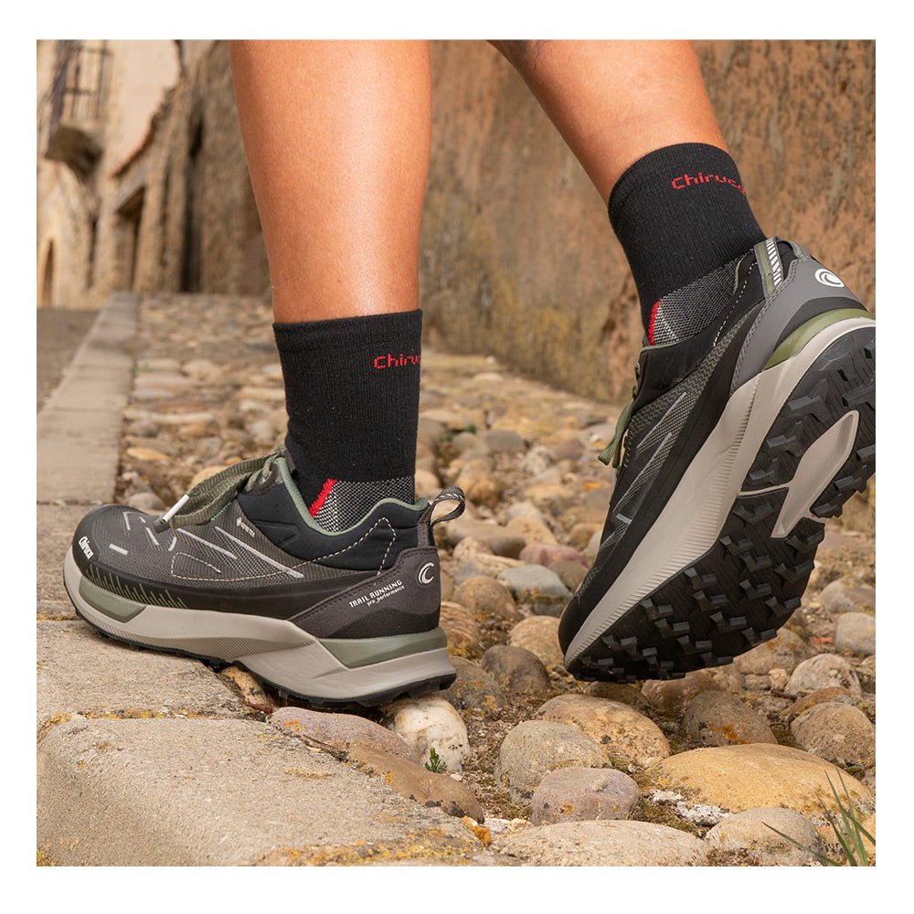 Markowe buty wodoodporne Chiruca model Sucre Gore-Tex przy Kolor szare i zielone, idealne do wędkowania, pieszych wędrówek i lekkiego trekkingu..