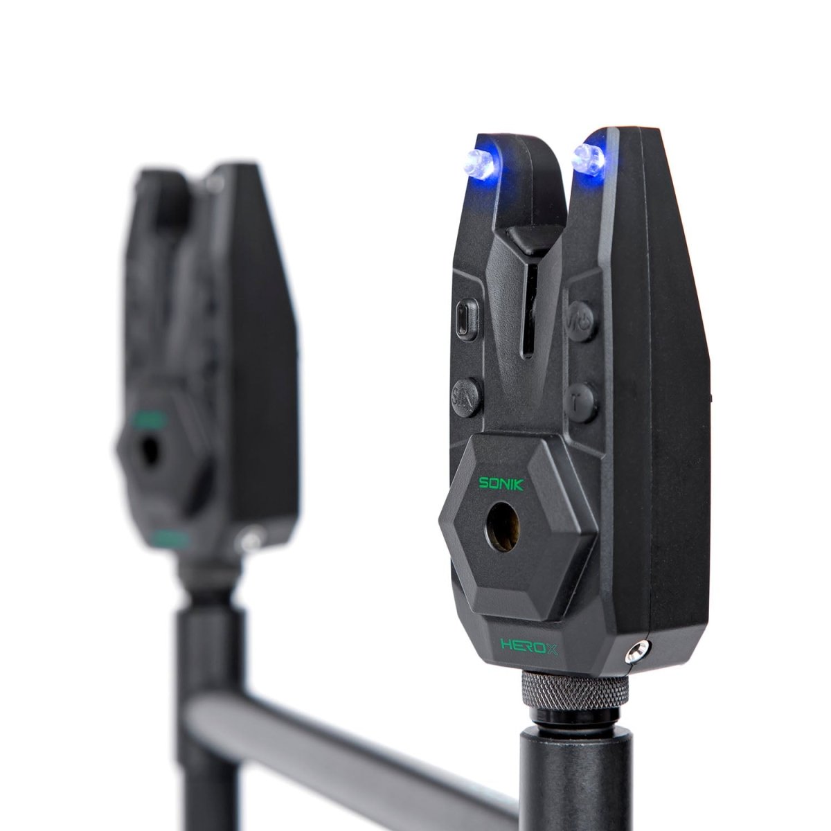 Zestaw alarmów 3+1 marki Sonik model Herox. Zestaw składa się z 3 alarmy przy Kolor niebieski, zielony y czerwony, a centralaspecjalna do łowienia karpi.