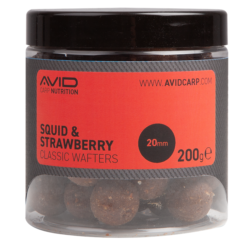 Wafters marki Avid Carp, zakres Classic, smak Squid & Strawberry, specjalny do połowu karpi.