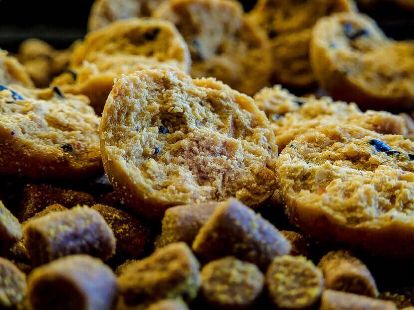 - SKŁAD Mączka sojowa, karma dla ptaków, mąka z orzechów tygrysich, zbożowe produkty uboczne, nasiona Nigru, całe żółte jaja, sól himalajska, olej konopny, białka mleka, zootechniczne środki konserwujące, aromaty.