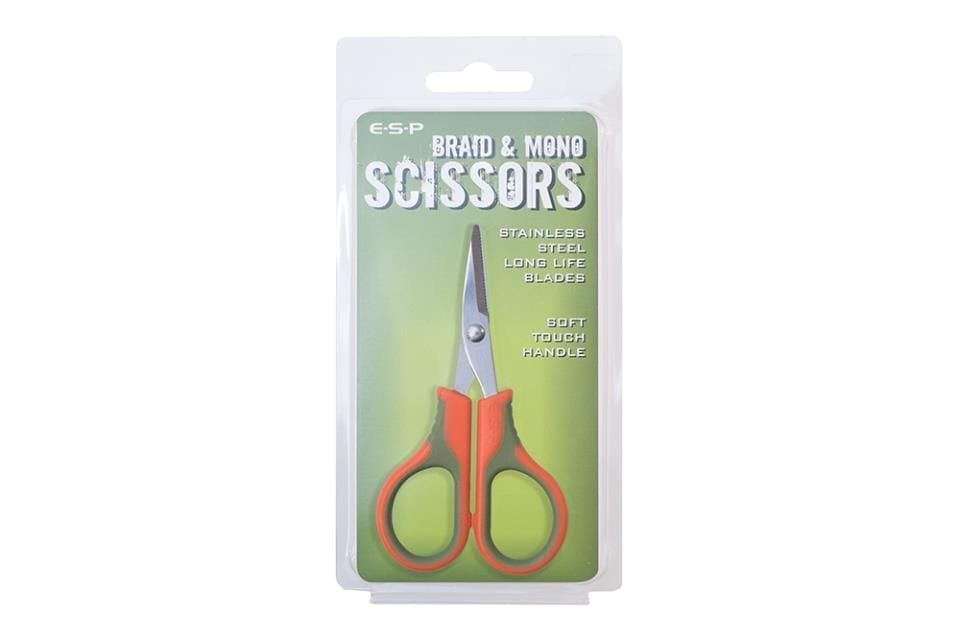 Markowe pomarańczowe nożyczki ESP, idealne do cięcia większości nici, plecionek lub żyłek wędkarskich, szczególnie do łowienia karpi.